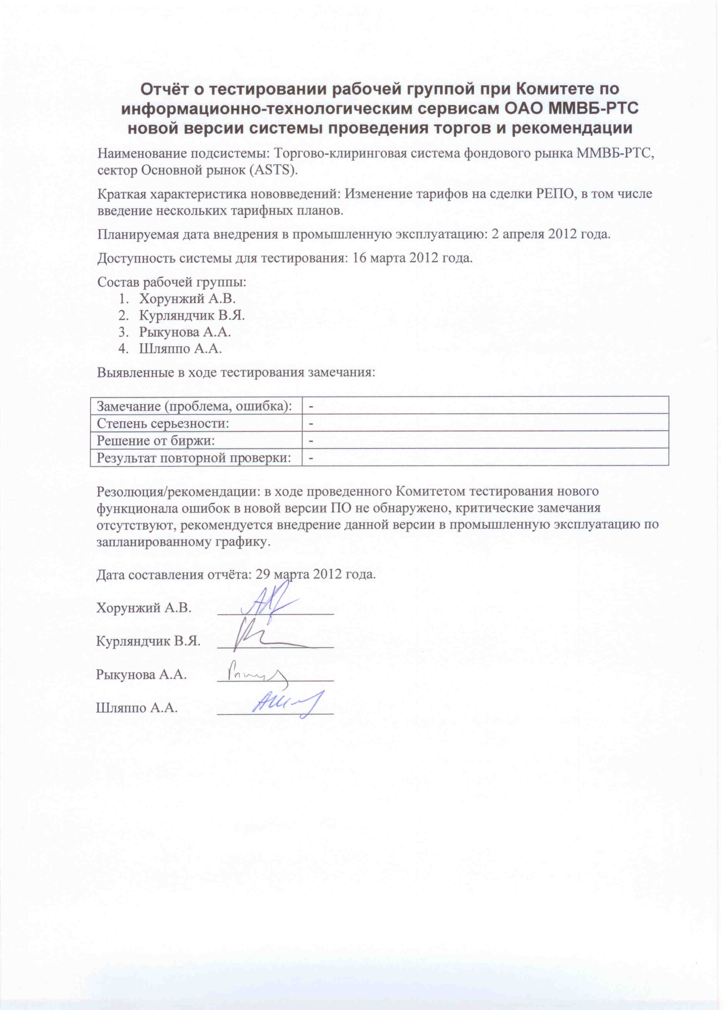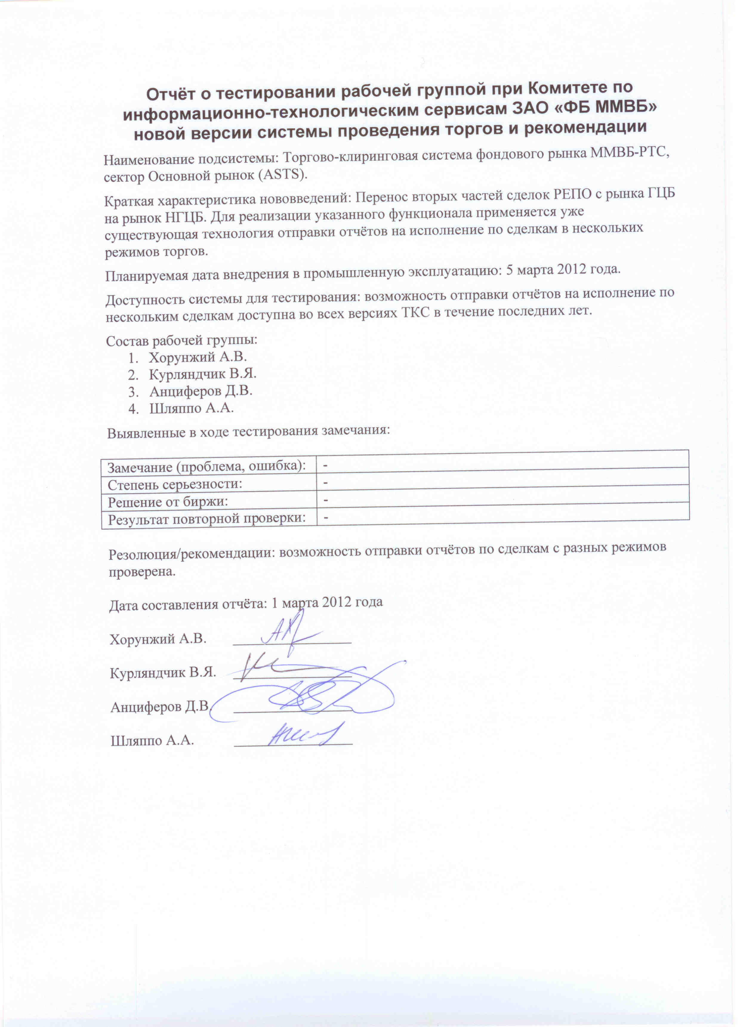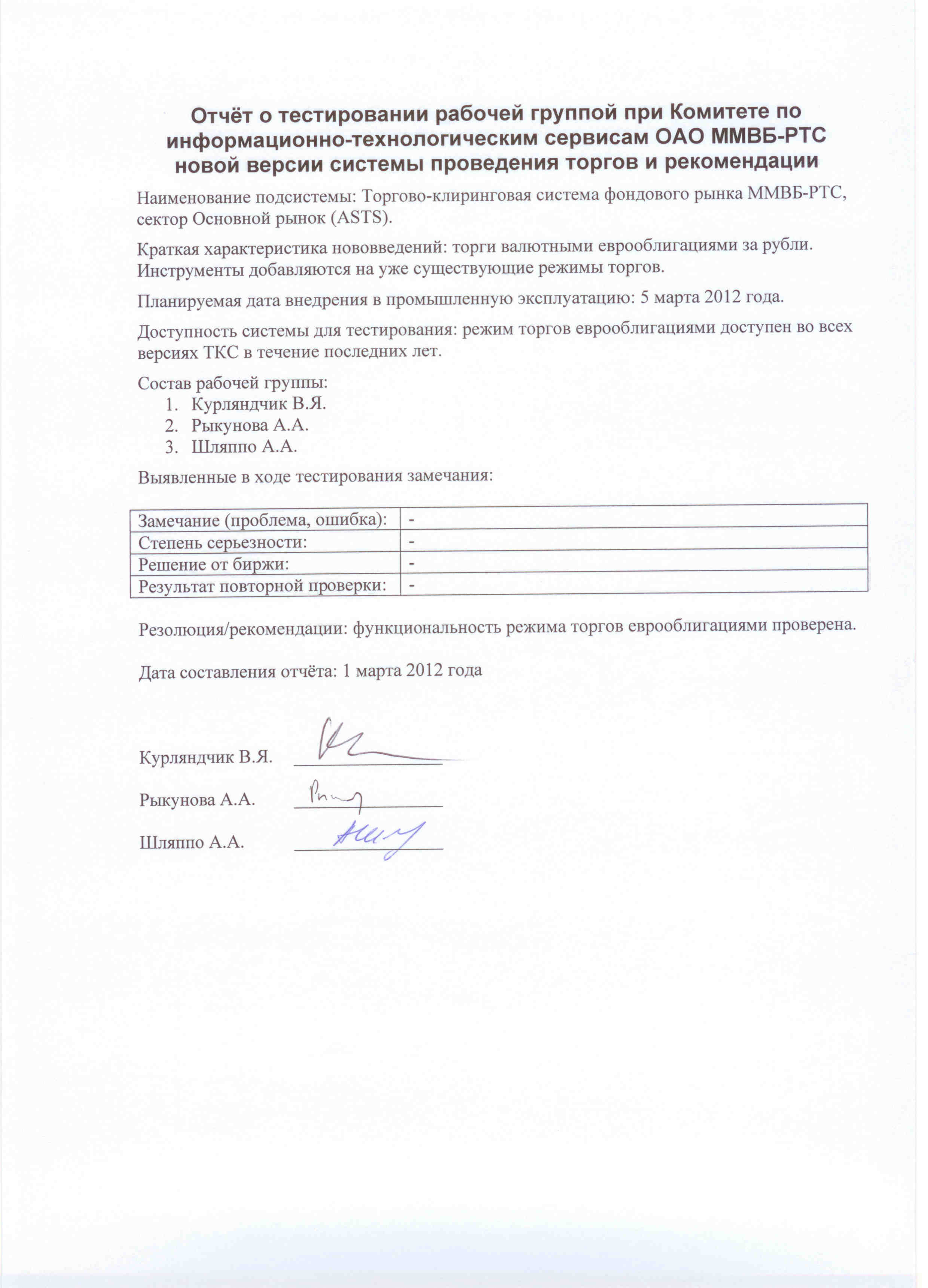 (PDF, 75 Кб) - Отчёт о тестировании рабочей группой при Комитете по информационно-технологическим сервисам ОАО «ММВБ-РТС» новой версии системы проведения торгов и рекомендации 01.03.12
