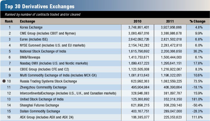 По информации FIA, объем торгов фьючерсами и опционами на рынке FORTS в 2011 году превысил 1 млрд контрактов, что на 73,5% больше чем в 2010 году. По этому показателю российская площадка замыкает "тройку" лидеров после United Stock Exchange of India (+181%) и ASX Group (+111,8%). Всего в мире объем торгов производными финансовыми инструментами вырос в прошлом году на 11,4% достигнув 25 млрд контрактов. Наибольший оборот приходится на площадки Азиатско-Тихоокеанского региона, где объем торгов деривативами составил 9,8 млрд контрактов, на втором месте Северная Америка – 8,2 млрд, на третьем Европа – 5 млрд. Таким образом доля FORTS в мировом обороте деривативов превышает 4%, а в Европе 20%. "Десятка" крупнейших деривативных бирж мира, куда третий год подряд входит FORTS, дает 83% мирового оборота производными финансовыми инструментами.