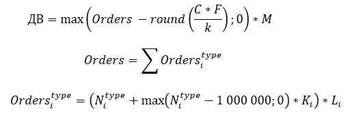L — коэффициент ликвидности актива, равен 0,5 (ноль целых пять десятых) для заявок, помеченных признаком "заявка Маркет-мейкера", равен 1 (единице) для всех остальных заявок; 𝑂𝑟𝑑𝑒𝑟𝑠 — общее (сумма) приведенное количество заявок.