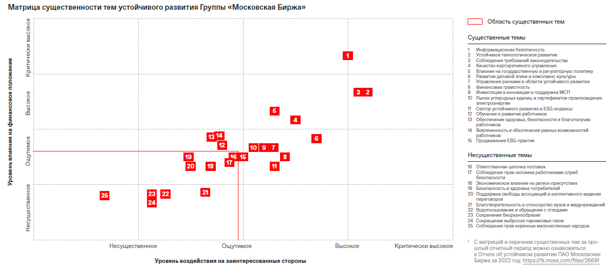 - Направления связаны с важнейшими задачами, рисками и возможностями в области ESG, с которыми сталкивается Группа "Московская Биржа" и которые присущи отрасли Биржи.